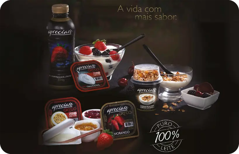 Reposicionamento da marca APRECIARE com novo conceito que combina sabor, saúde e inovação, assinando 28 produtos. Leite Fermentado Triplo Zero, Requeijão Light, e Iogurte Apreciare + Whey são pioneiros no Brasil.