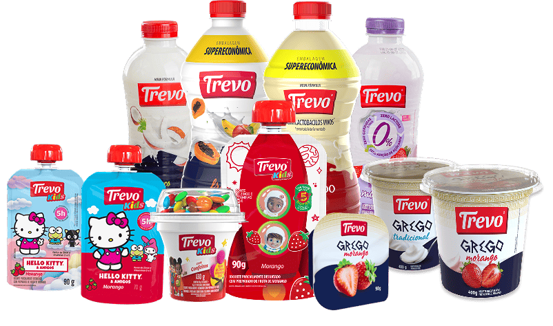 Temos a nossa linha Trevo, que conta com iogurtes regulares, gregos, sobremesas e leite fermentado, além da linha Tripla Atitude, feita especialmente para pessoas que buscam produtos sem gordura, sem lactose e sem adição de açúcares.